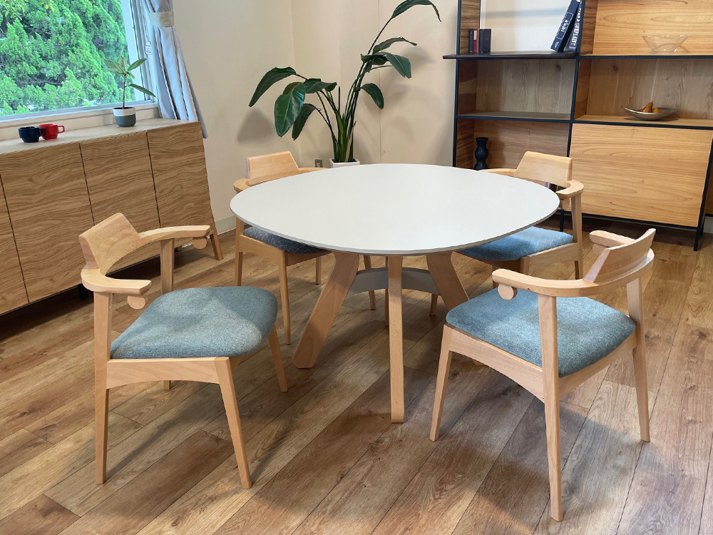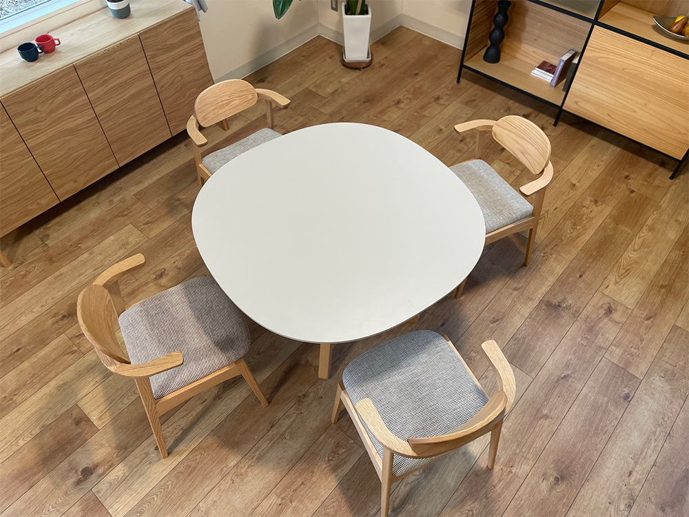 印象的なデザインで空間に華やかさと遊び心を与えます。角のない天板と脚部のRのラインが空間を柔らかな雰囲気の空間を演出します。