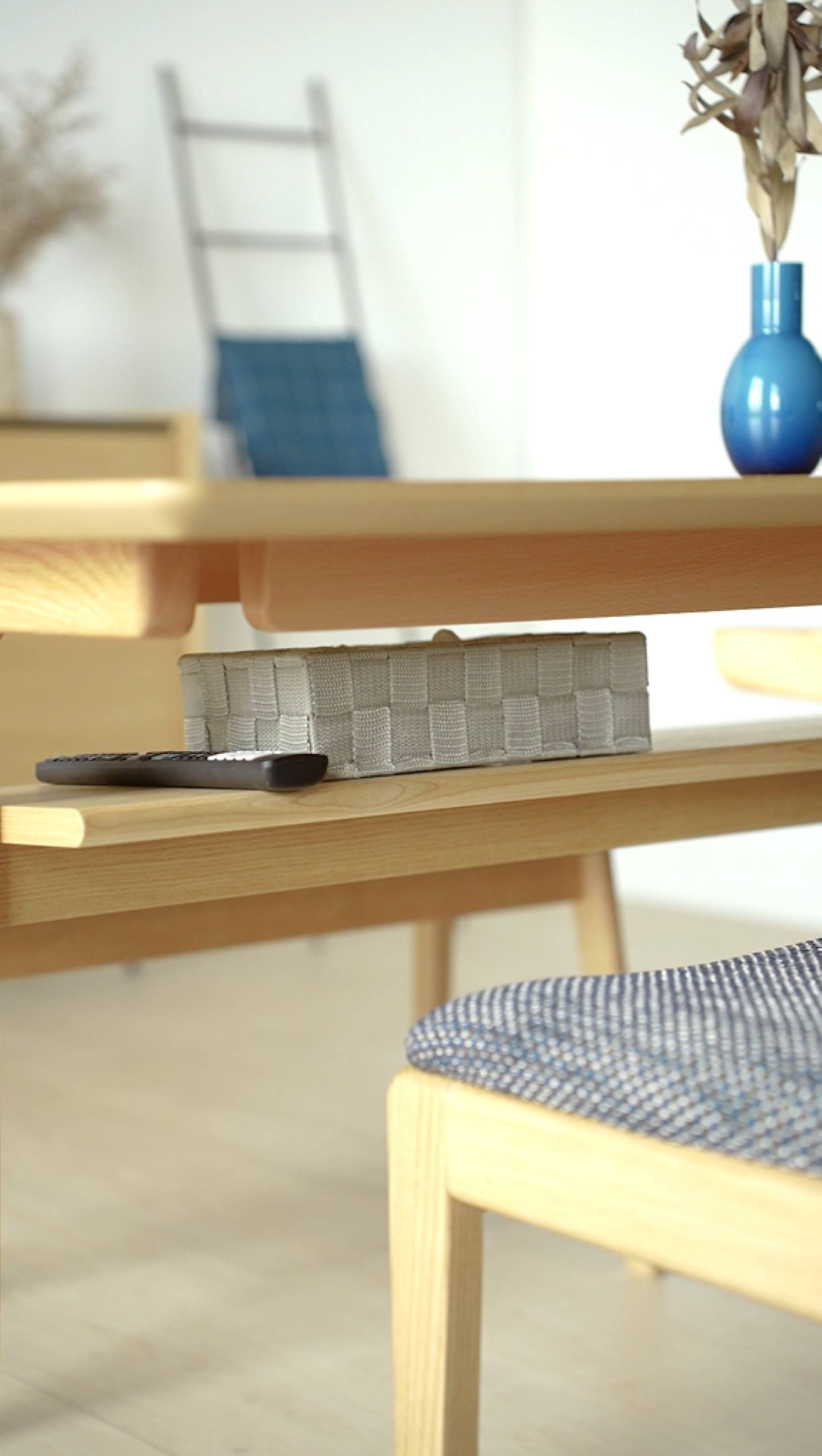 天板下の棚に、リモコンやティッシュなどを収納。